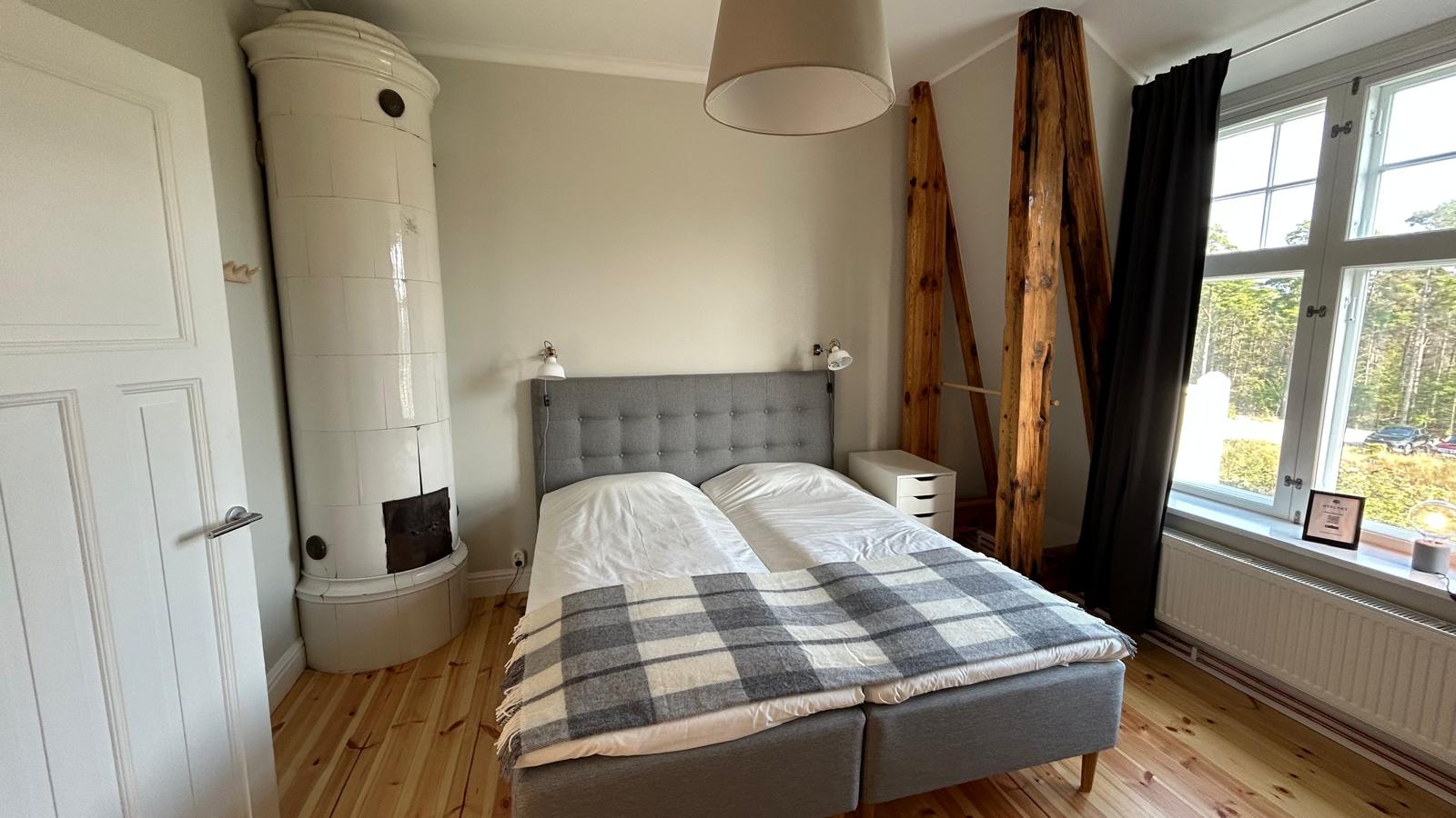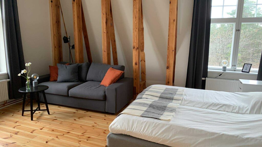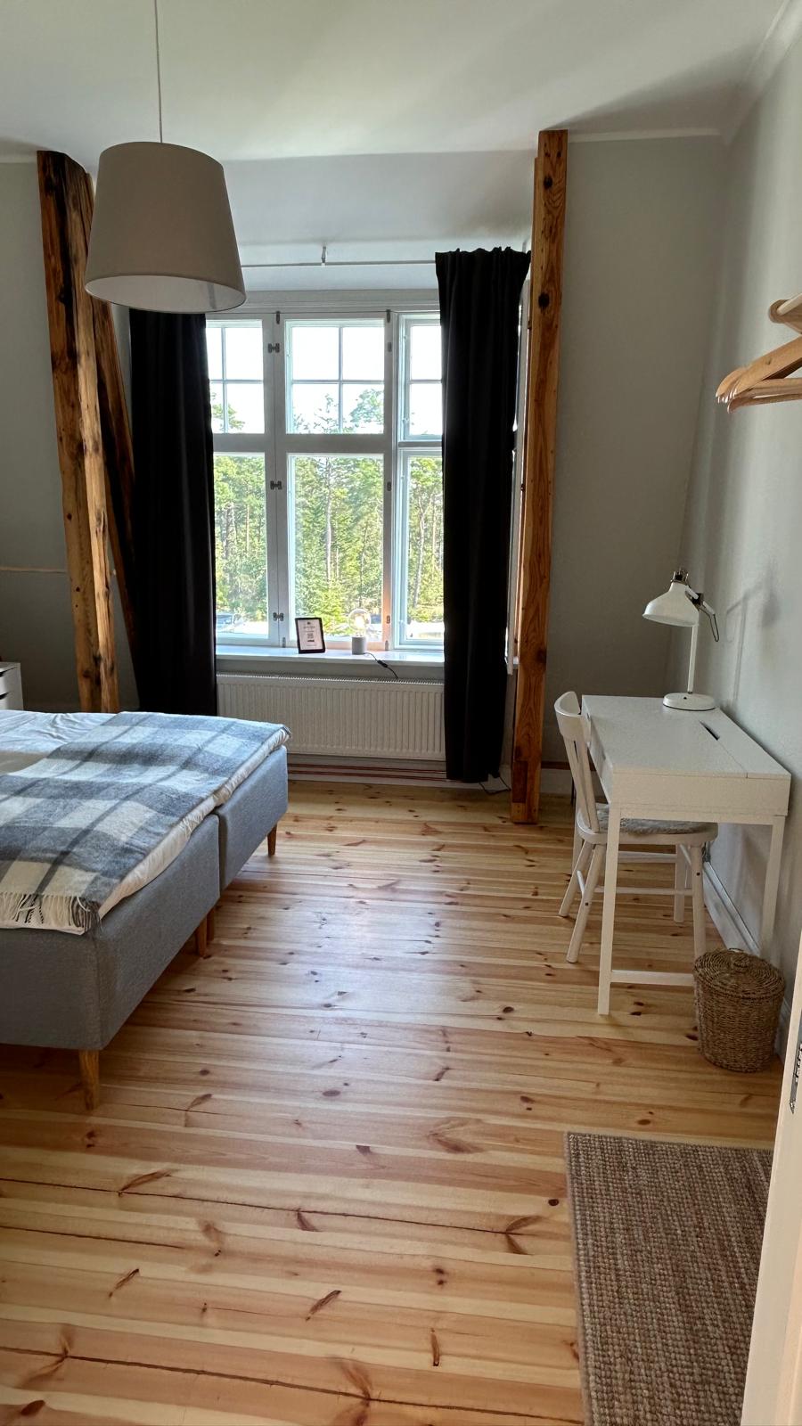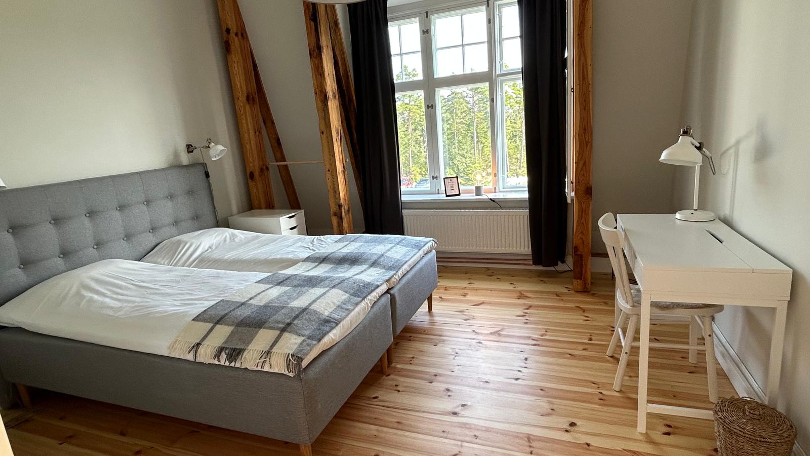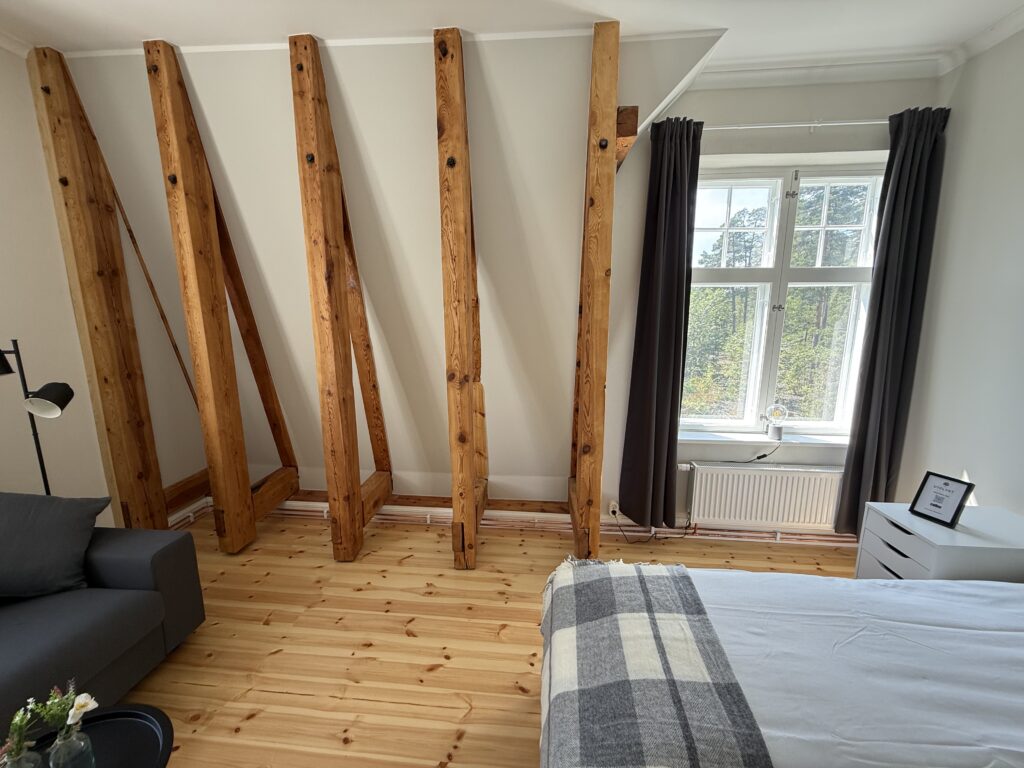 Vallmo har utsikt både från söder och väster och har ett fantastiskt ljusinsläpp. Rummet är på 24 kvm och det finns en bäddsoffa som kan bäddas ut för 1-2 personer med en bredd på 140 cm. Kaffvinden har tagits bort och fina bjälkar är synliga. Rummet har egen toalett.