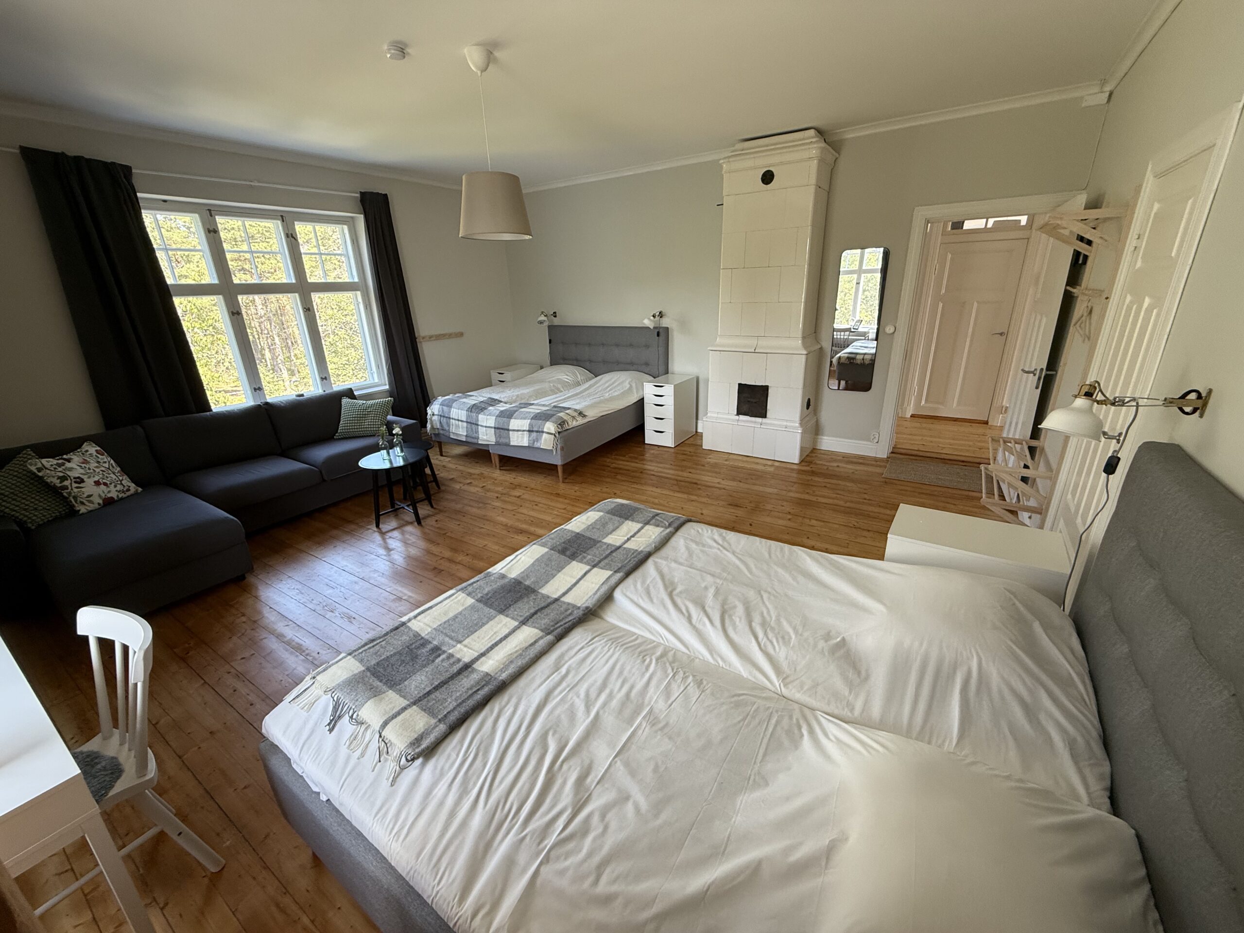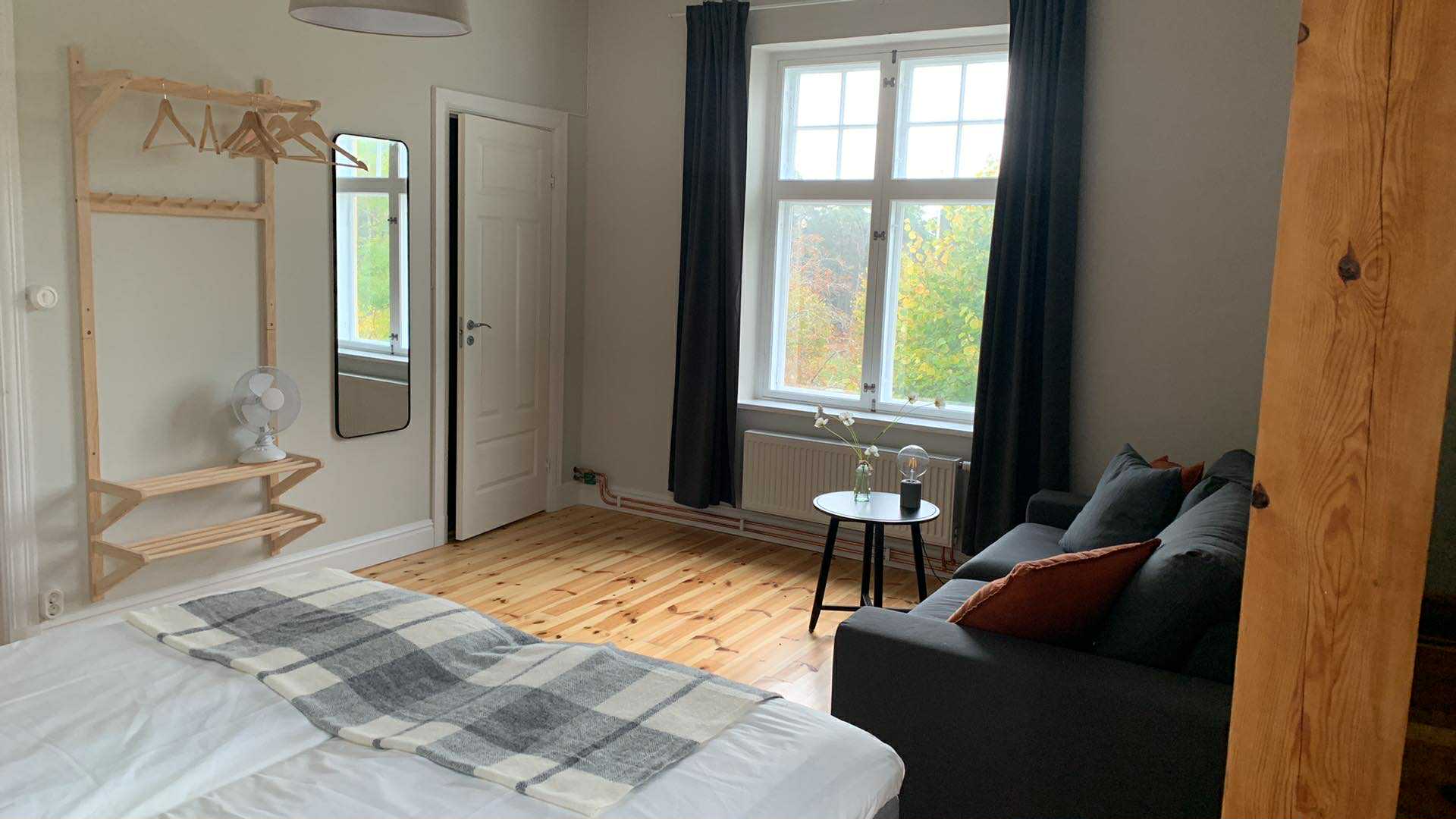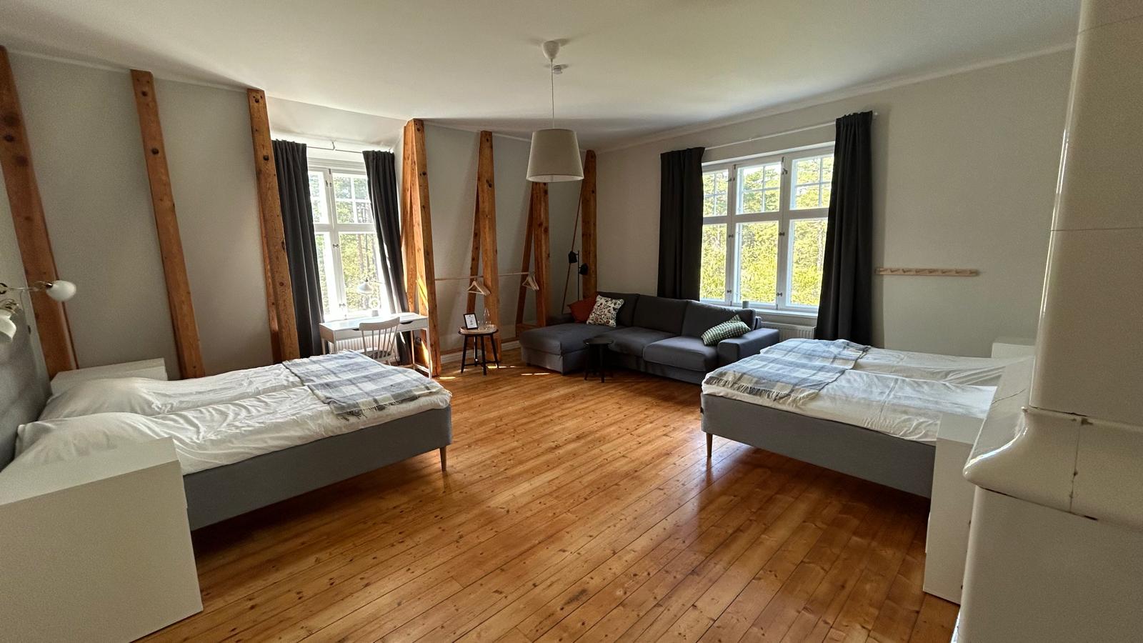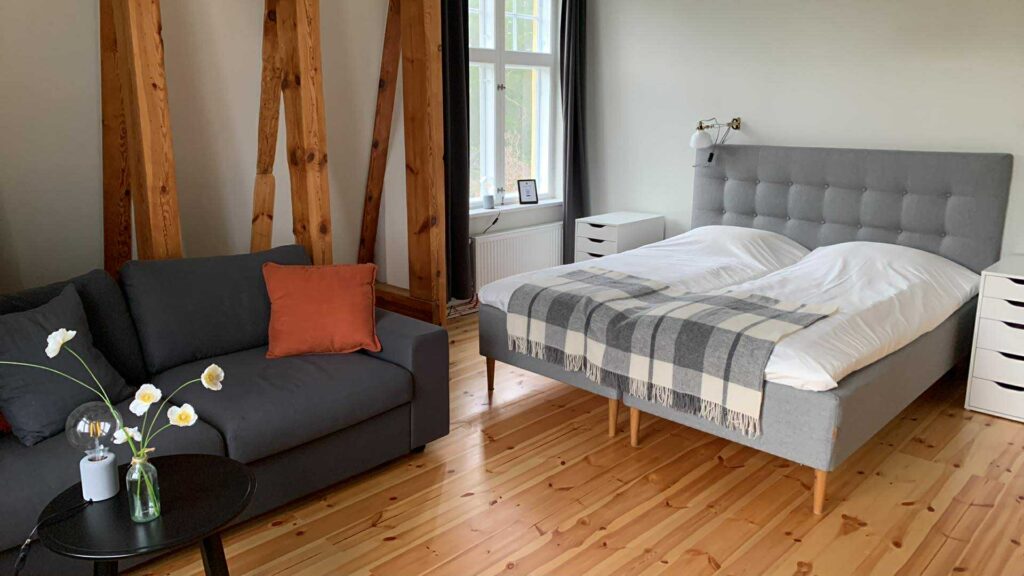 Vallmo har utsikt både från söder och väster och har ett fantastiskt ljusinsläpp. Rummet är på 24 kvm och det finns en bäddsoffa som kan bäddas ut för 1-2 personer med en bredd på 140 cm. Kaffvinden har tagits bort och fina bjälkar är synliga. Rummet har egen toalett.