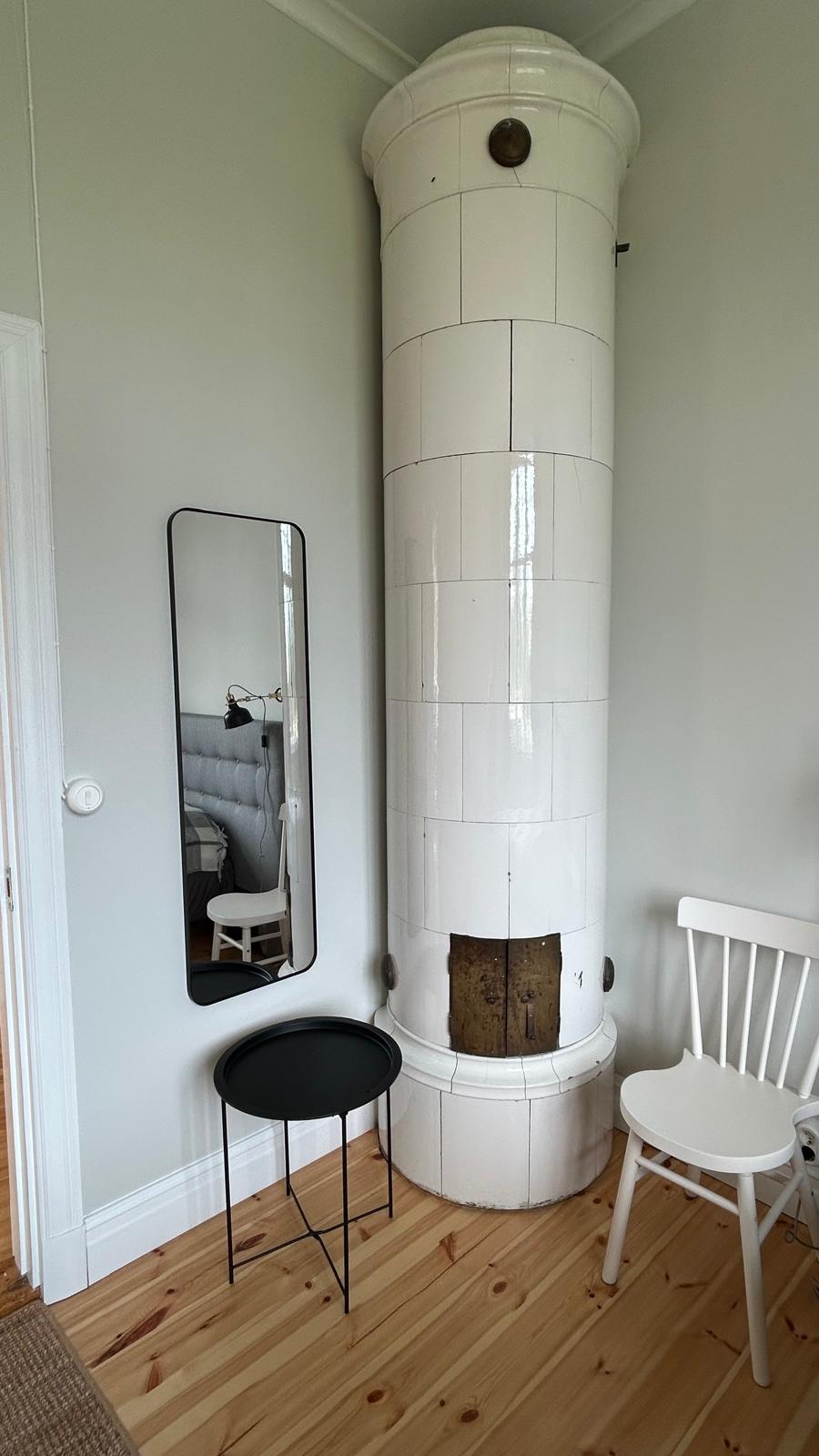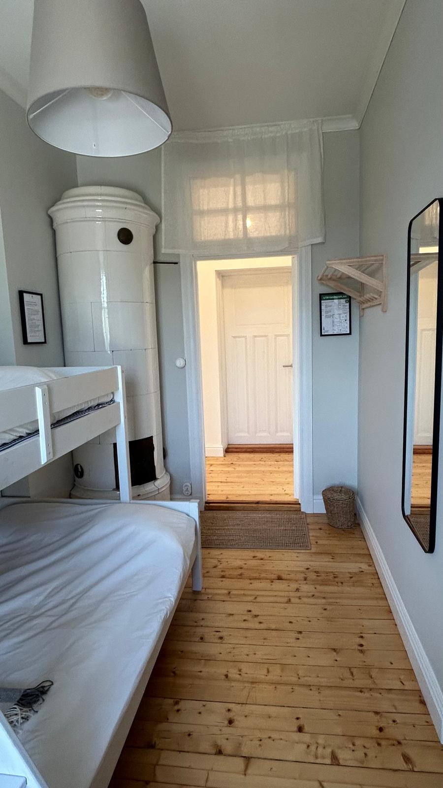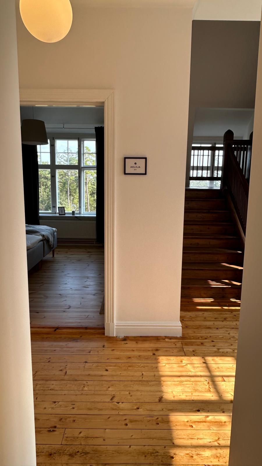 Akleja finns på övre våningen med god utsikt över gården och med havsglimt. Rummet är på 15 kvm och har en vacker kakelugn (ej eldningsbar) liksom ett skrivbord. Toalett finns några meter bort på andra sidan korridoren